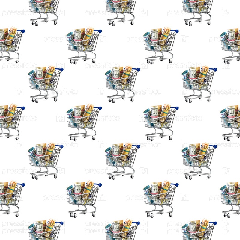 Бесшовный узор. Корзина, полная денег, изолированные на белом фоне