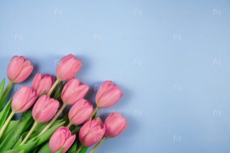 Розовые тюльпаны цветы на синем фоне. Карта на день матери. Плоская планировка, место для копирования текста