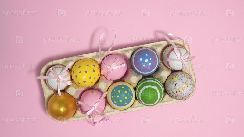 Красочные пасхальные яйца в картонной коробке на розовом фоне. яйца в бумажном контейнере для яиц. Разноцветное яйцо для счастливой пасхи. Здравствуй, весна и счастливая концепция праздника Пасхи. Вид сверху
