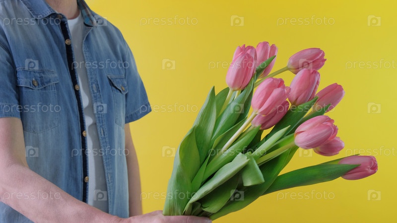Букет тюльпанов. Мужчина с букетом тюльпанов. Мужская рука дает букет цветов. Свежие розовые тюльпаны. День матери, 8 марта, День Святого Валентина, День рождения
