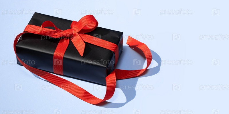 Черная подарочная коробка, перевязанная красной лентой на изолированном синем фоне. Подарочная коробка с красным бантом и лентами. Высокий угол зрения Рождественский подарок на синем фоне. Концепция праздника, баннер