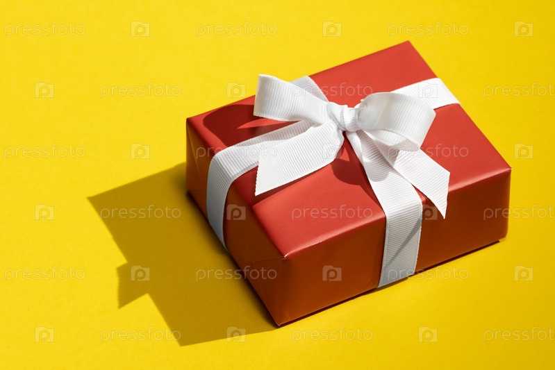 Красная подарочная коробка, перевязанная белой лентой на изолированном желтом фоне. Настоящая коробка с белым бантом и лентами. Высокий угол зрения Рождественский подарок на желтом фоне. Концепция праздника