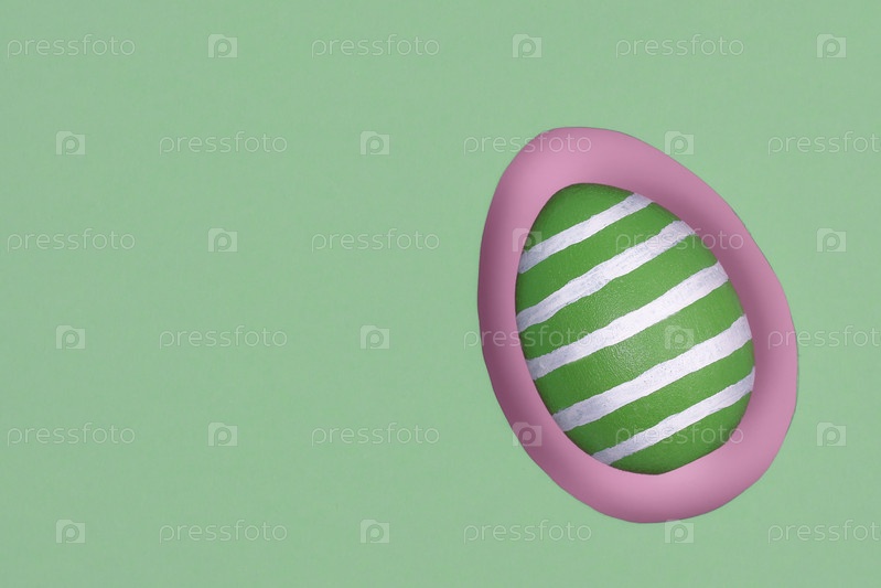 Окрашенное зеленое пасхальное яйцо на фоне розовой и зеленой бумаги. Счастливой Пасхи
