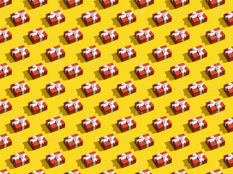 Бесшовный узор из красных подарочных коробок, перевязанных белыми лентами на желтом