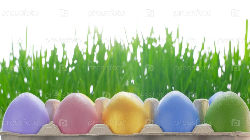 Красочные пасхальные яйца с зеленой травой на белом фоне. Карточка для счастливой Пасхи