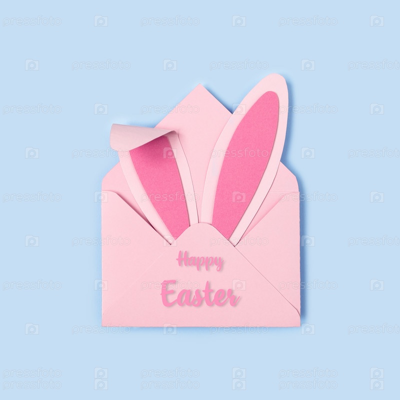 Счастливой Пасхи. Уши кролика из розовой бумаги в розовом конверте на синем фоне. Пасхальная открытка с конвертом. Счастливой Пасхи минимальная концепция с копировальным пространством. Квадратный формат, плоская планировка