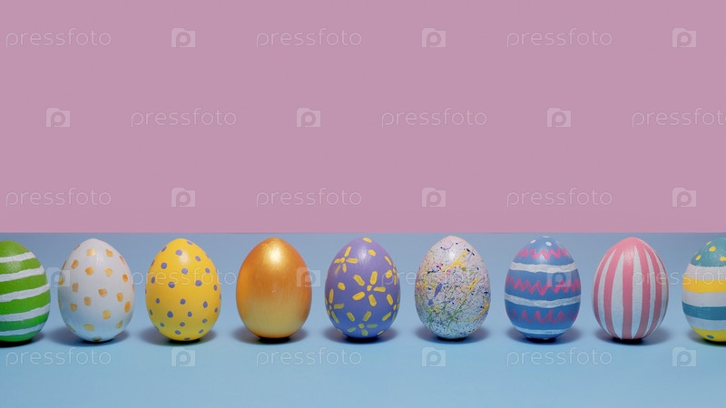 Красочные пасхальные яйца на синем и розовом фоне. Карточка для счастливой Пасхи. Открытка. Плоская планировка, вид сверху, пространство для копирования