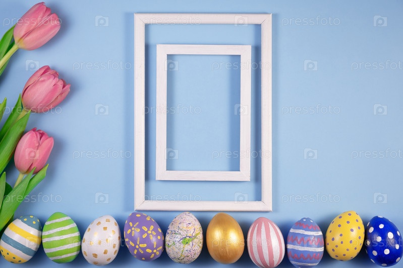 Цветы тюльпанов и пасхальные яйца с деревянной рамой на синем фоне. Карточка для счастливой Пасхи