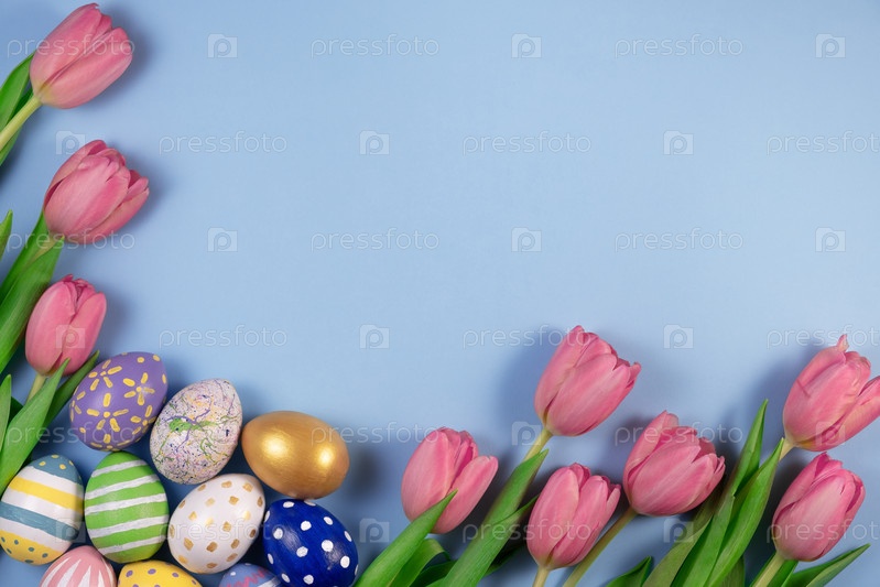 Розовые цветы тюльпанов и красочные яйца на розовом фоне. Карточка для счастливой Пасхи