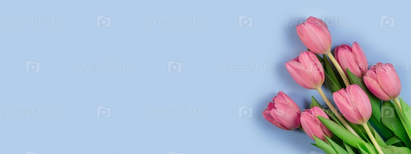 Розовые тюльпаны цветы на синем фоне. Открытка на день матери, 8 марта, счастливой пасхи, день святого валентина, широкое знамя