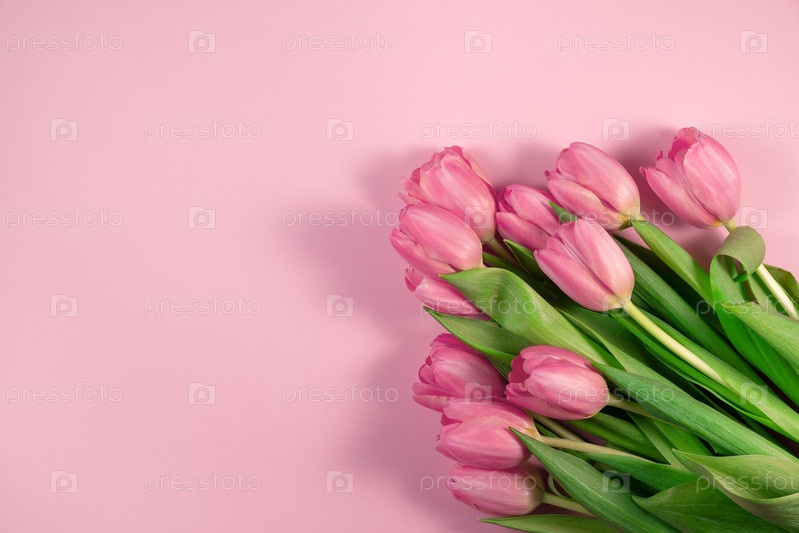 Розовые тюльпаны цветы на розовом фоне. Открытка на День матери, 8 марта, Пасха, День Святого Валентина, День рождения
