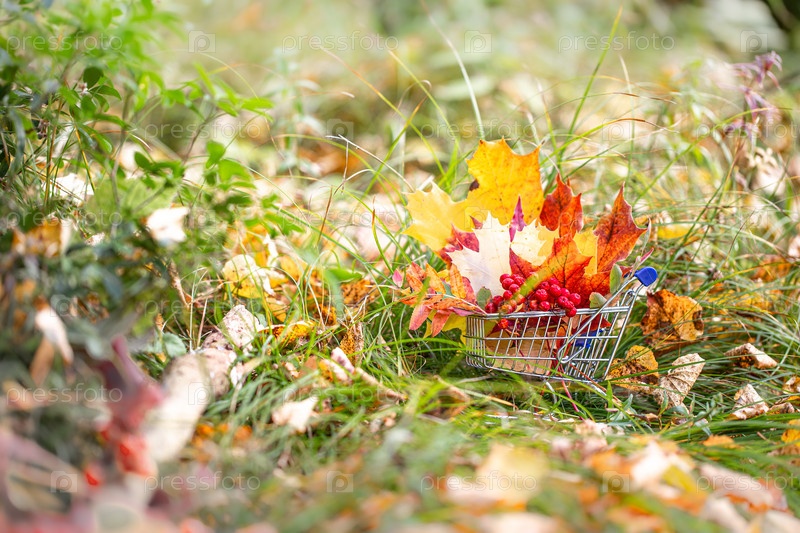 Осень. кленовые листья, ягоды в тележке супермаркета