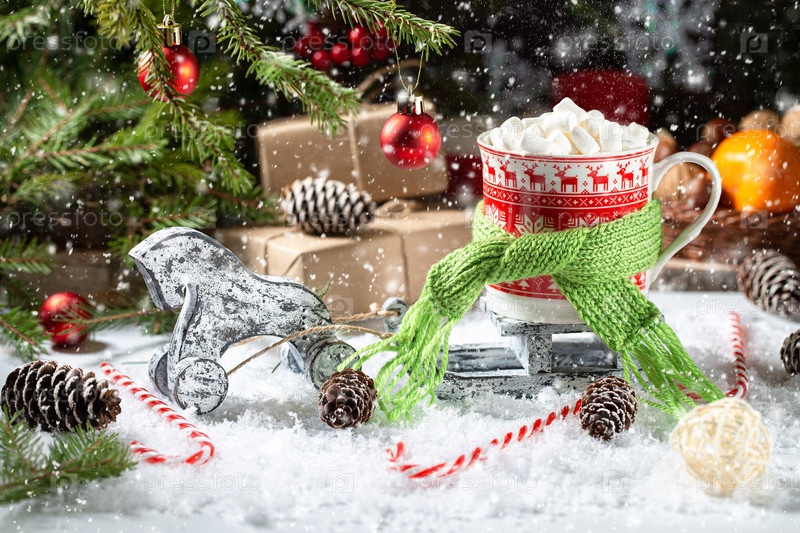Рождественский завтрак со снегом, подарками, елкой и мандаринами