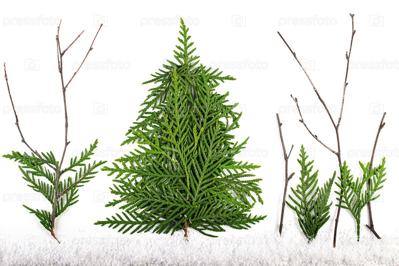 Зеленая рождественская елка из ветвей хвойных деревьев на белом фоне