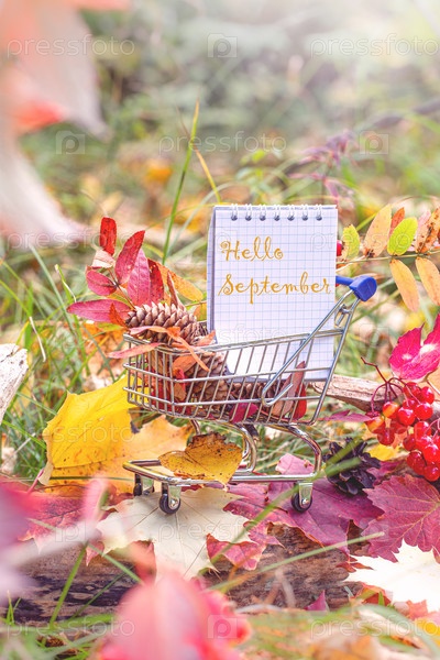 Осень. кленовые листья, ягоды и блокнот в тележке супермаркета