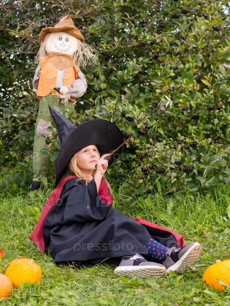 Хэллоуин. Девочка в мантии и шляпе. Маленькая волшебница в костюме