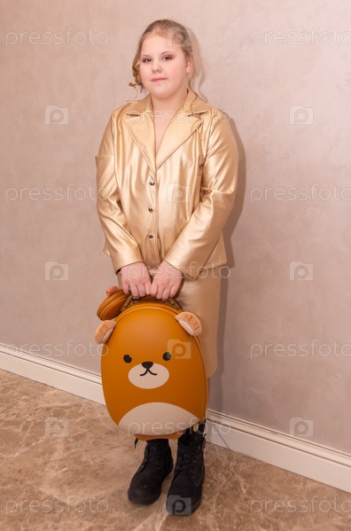 Девочка в красивом модном платье с детским чемоданом