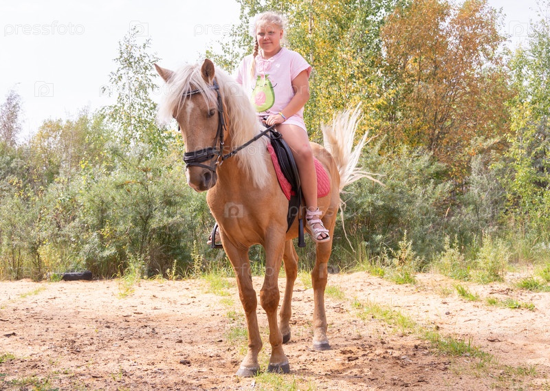 На улице в прекрасный теплый день девочка катается на лошади