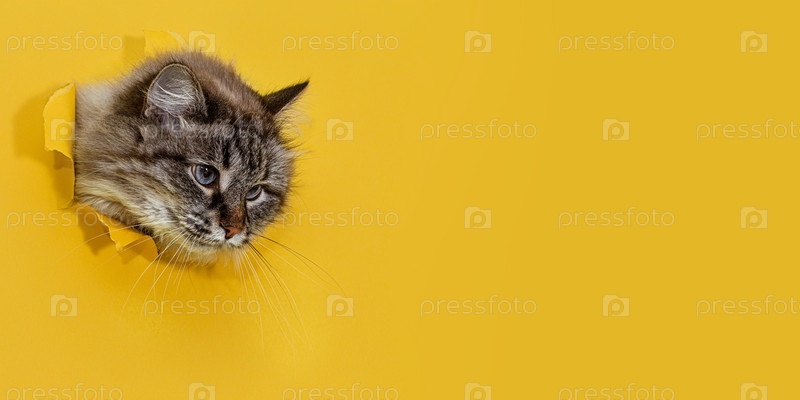 Пушистый кот выглядывает из прорванной дыры в желтой бумаге. баннер