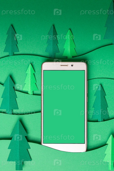 3D выскакивают бумажные елки на зеленом фоне. Вид сверху. Плоская планировка