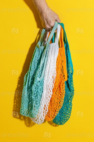 Мужская рука держит пустые сетчатые сумки на желтом фоне. Экологически чистый мешок без отходов