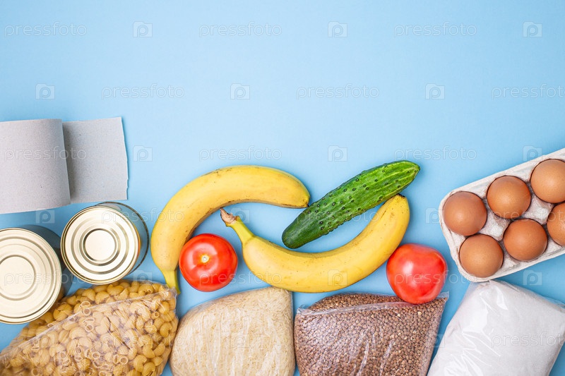 Доставка еды. Рис, гречка, макароны, консервы, сахар, туалетная бумага на синем фоне