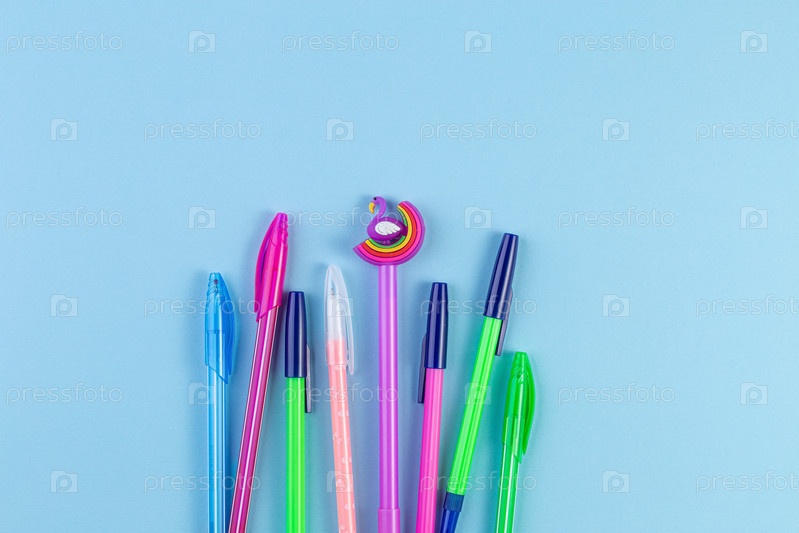 Набор цветных ручек на фоне синей бумаги с копией пространства