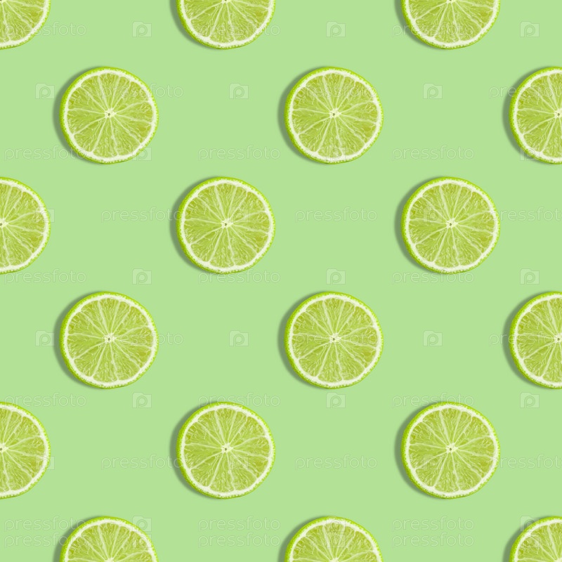 Красочные фрукты бесшовные модели из свежих ломтиков лайма на зеленом фоне. Модный солнечный свет Летний узор. Минимальная летняя концепция. плоская текстура еды