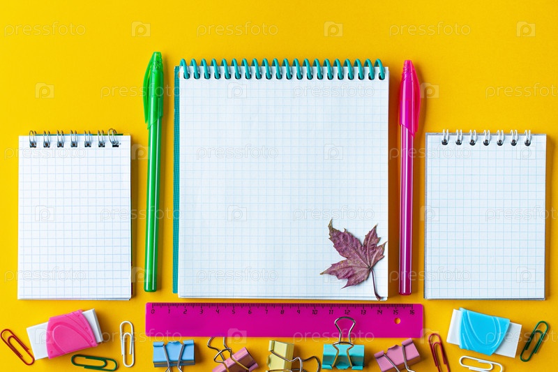 Школьные принадлежности на желтом фоне. Концепция Здравствуй, сентябрь или снова в школу