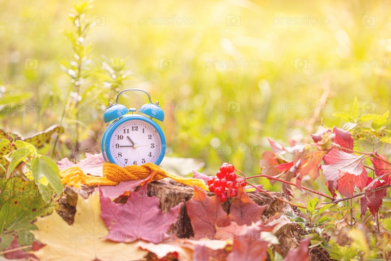 Винтажный будильник и кленовые листья в осеннем лесу