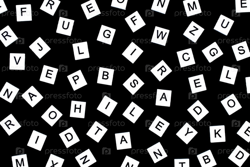Алфавитный фон в черно-белом цвете. Английский алфавит. Деревянные буквы на черном фоне
