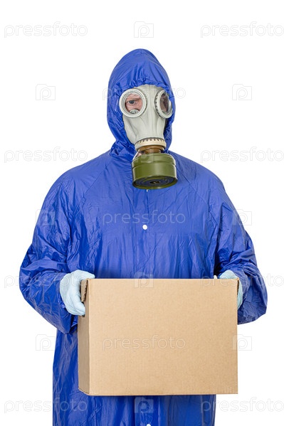 Мужчина в противогазе держит в руках картонную коробку. Доставка товаров во время карантина