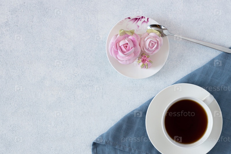 Чайный сервиз в композиции с цветами алтея. вид сверху, копия пространства. Кофейная кружка на блюдце. на светло-сером фоне
