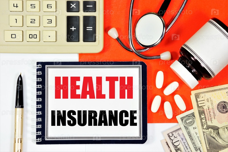 Медицинская страховка. Надпись в папке на фоне калькулятора, наличных денег, лекарств и стетоскопа. Программа оплаты медицинских услуг, обеспечивающая благополучие