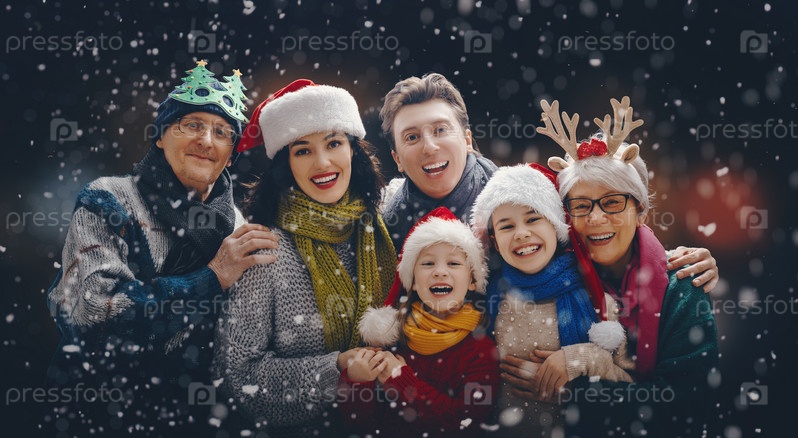 Портрет любящей семьи на темном снежном фоне