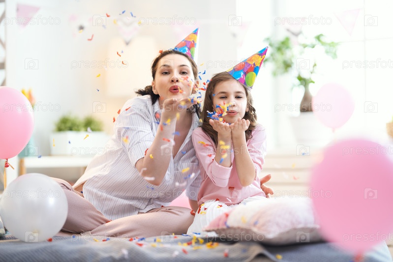 Веселое время. Мама и ее дочь играют дома. Девочки бросают конфетти. Семейный отдых и единение