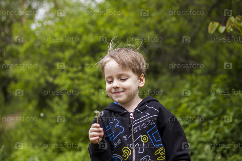 Счастливый мальчик в весенний день в саду дует на белые одуванчики, с него слетает пух. Концепция отдыха на природе в детстве. Портрет милого мальчика