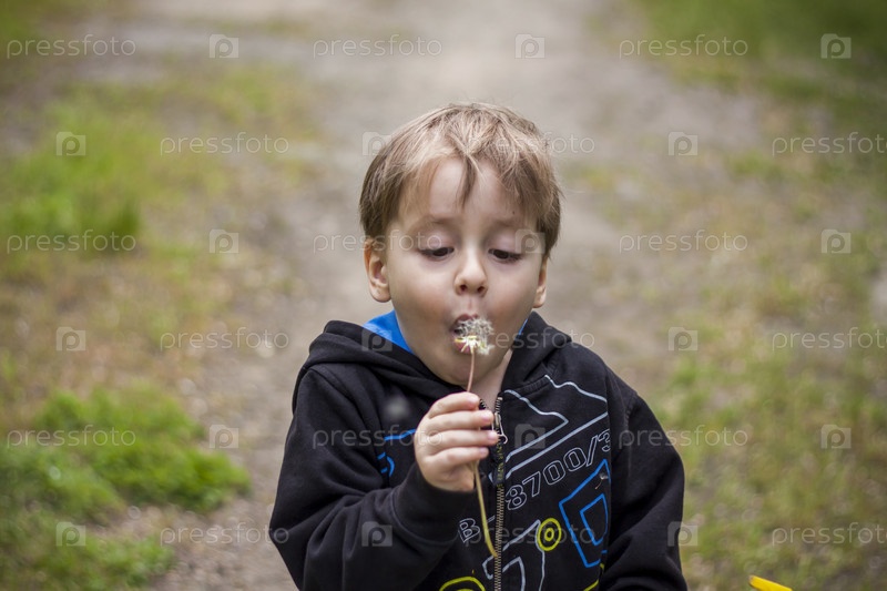 Счастливый мальчик в весенний день в саду дует на белые одуванчики, с него слетает пух. Концепция отдыха на природе в детстве. Портрет милого мальчика