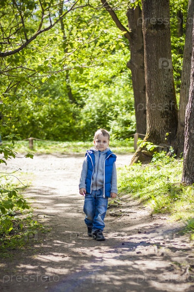 Портрет мальчика в голубой майке в лесу весной. Прогуляйтесь по зеленому парку на свежем воздухе. Волшебный свет от солнечных лучей падает за мальчика