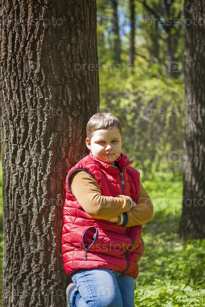Портрет молодого человека в красной майке в лесу весной. Прогулка по зеленому парку на свежем воздухе. Волшебный свет от солнечных лучей падает за мальчика