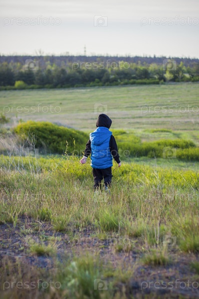 Дети на просторах поля гуляют среди сочной весенней травы в свете заката по узкой протоптанной дорожке