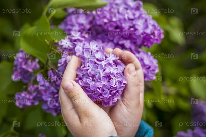 Детские руки нежно держат букет лиловой сирени. Взаимодействия. Выборочный фокус