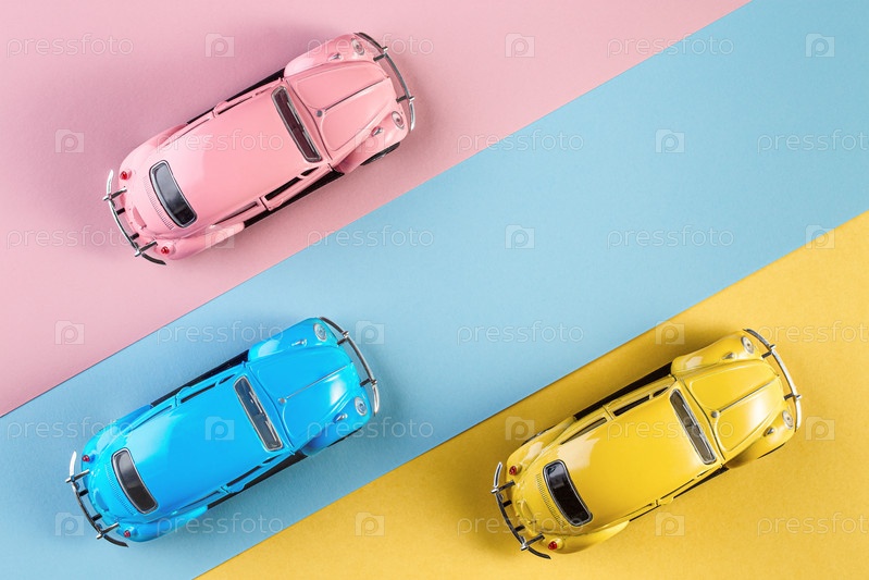 Ижевск, Россия, 15 февраля 2020 г. Маленькие винтажные ретро-машинки на розовом, желтом и синем фоне
