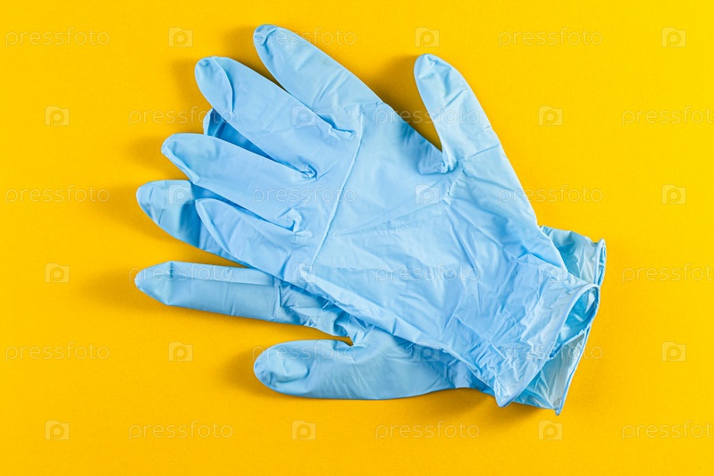 Пара новых синих латексных защитных перчаток на желтом фоне