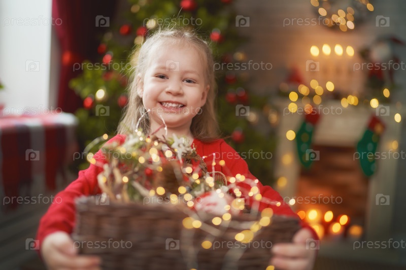 Ребенок с гирляндами возле дерева дома