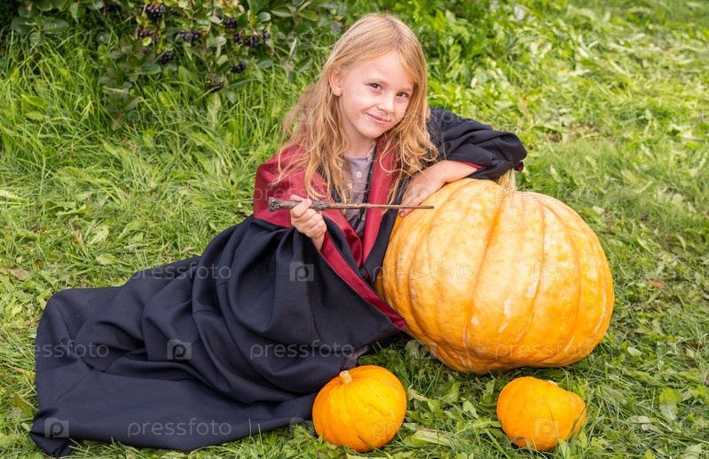 Хэллоуин. Девочка в мантии и шляпе. Маленькая волшебница в костюме