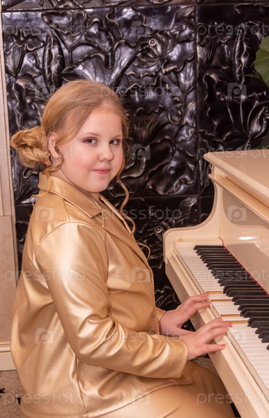 Девочка в красивом модном платье играет на белом рояле