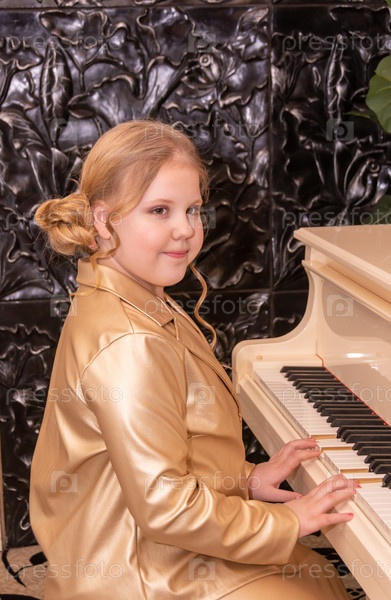 Девочка в красивом модном платье играет на белом рояле