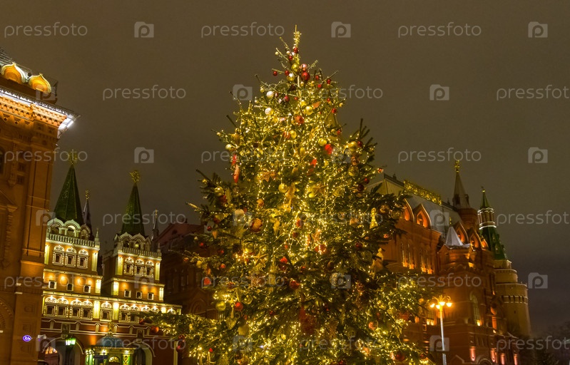 Большая новогодняя елка на Площади Революции на фоне здания Исторического музея и Иверской часовни. Москва. Ежегодный фестиваль "Путешествие в Рождество"
