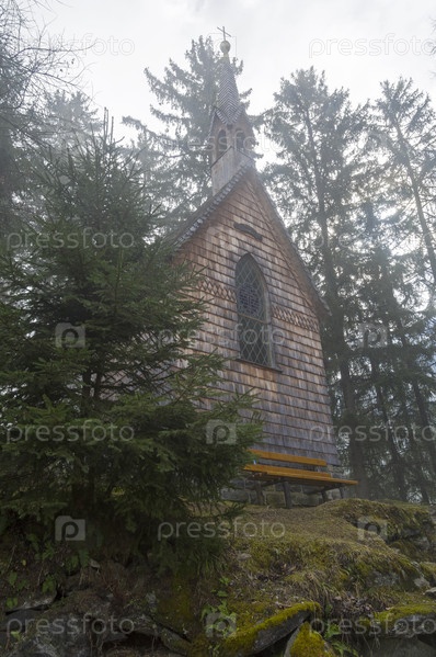 Маленькая часовня в лесу на склоне горы. Австрийские Альпы, Тироль, окрестности горнолыжного курорта Майрхофен